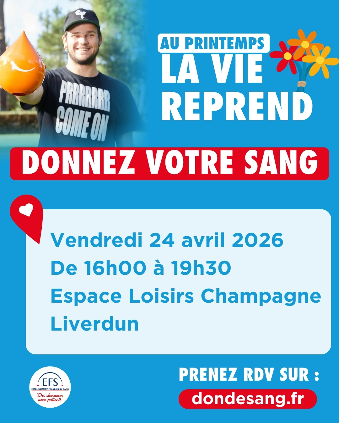 Les bénévoles de l'association Coeur de Sang seront présents pour vous accueillir chaleureusement vendredi 24 avril de 16h à 19h30 à L'Espace Loisirs Champagne de Liverdun avec une collation de petits plats faits maison. Et en bonus une démonstration aux gestes qui sauvent par les Sauveteurs Volontaires de Proximité de Liverdun.